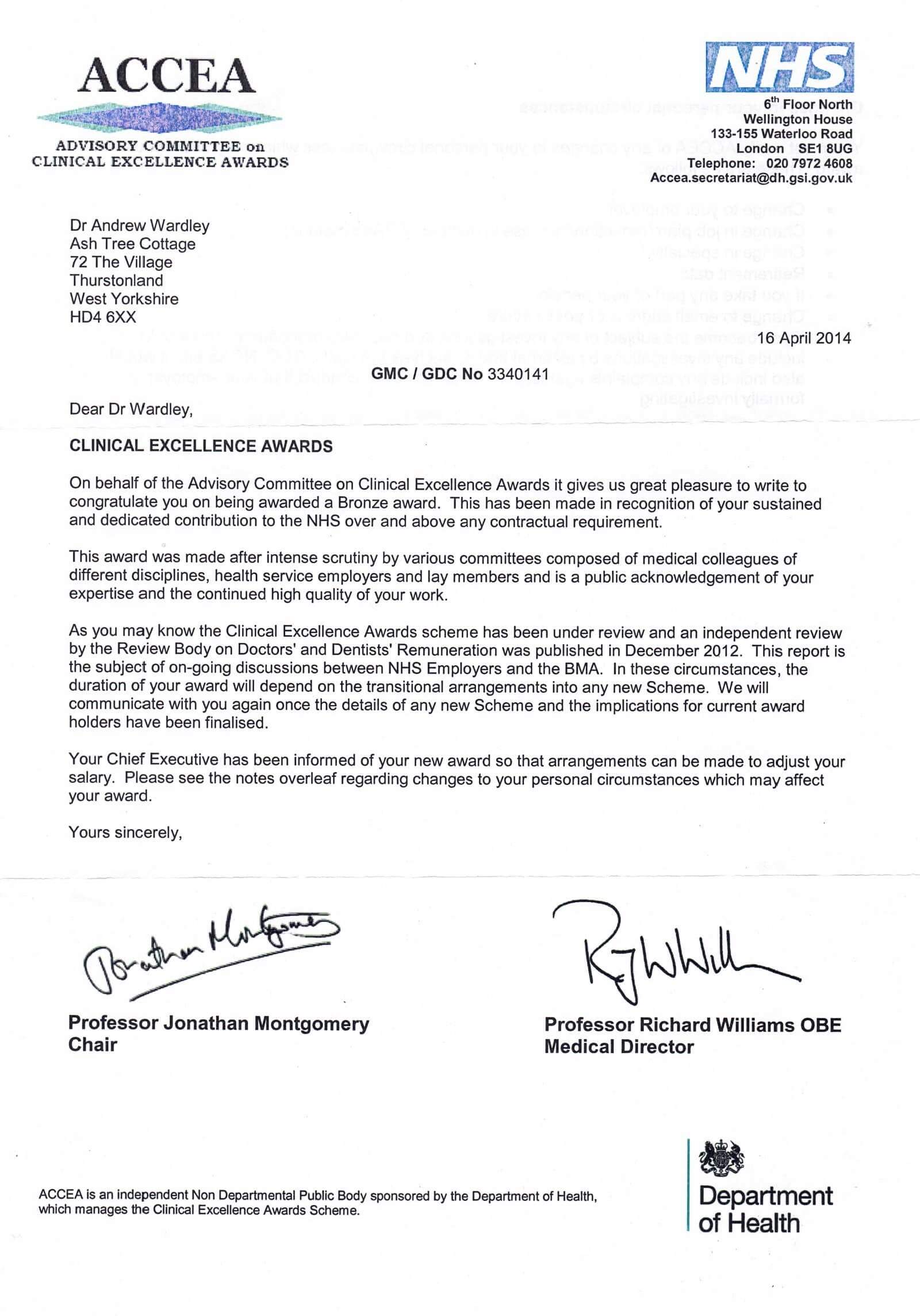 He was awarded a Chair at Manchester Academic Health Science Centre for his system leadership in cancer and an Honorary Clinical Chair at University of Manchester for breast research of international standing. As a full-time NHS consultant he was awarded an ACCEA Silver Award for contributions over and above.